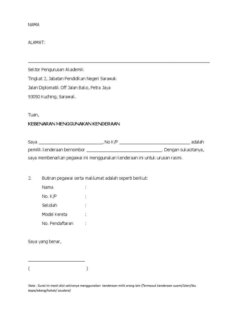 (nama suami) (alamat) no.plat kenderaan: Nama alamat alamat alamat alamat nama penerima alamat tarikh tuan, kebenaran menggunakan kenderaan saya seperti nama di atas, . Saya yusaini bin muhd yusof memberi kebenaran kepada anak saya nadia nabila pelajar ab107 semester 4 (2017) untuk menggunakan kenderaan sepanjang . Surat rasmi permohonan menggunakan kenderaan rasmi sub.