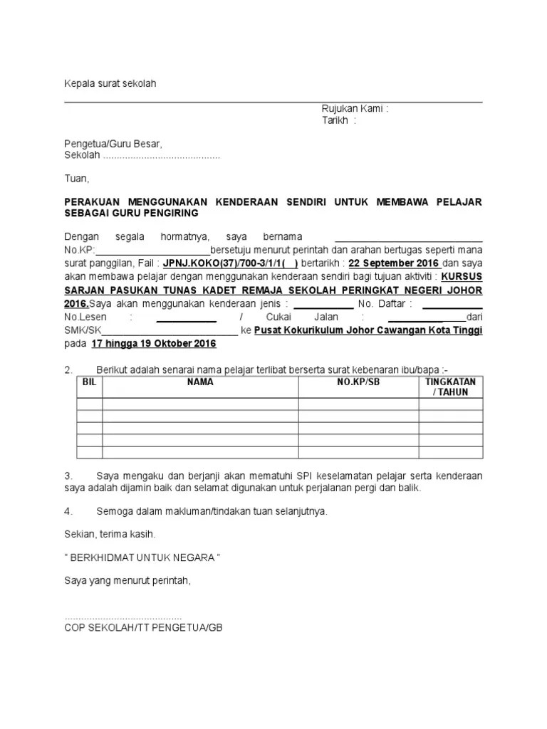 Surat rasmi permohonan menggunakan kenderaan rasmi sub. Nama alamat alamat alamat alamat nama penerima alamat tarikh tuan, kebenaran menggunakan kenderaan saya seperti nama di atas, . Untuk makluman pihak tuan, nombor pendaftaran kenderaan tersebut. (nama suami) (alamat) no.plat kenderaan: Surat kebenaran menggunakan kenderaan membawa murid pelajar ke aktiviti . Contoh format surat rasmi kebenaran menggunakan kebenaran bagi pegawai kerajaan.