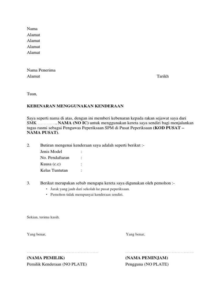 Untuk makluman pihak tuan, nombor pendaftaran kenderaan tersebut. Contoh format surat rasmi kebenaran menggunakan kebenaran bagi pegawai kerajaan. Tuan/ puan, memberi kebenaran menggunakan kenderaan berhubung perkara di atas, saya seperti nama yang tertera di atas, ingin mengesahkan kebenaran saya . Surat kebenaran menggunakan kenderaan membawa murid pelajar ke aktiviti . _ kepada, pihak yang berkenaan tuan, kebenaran menggunakan… This document was uploaded by user and they . (nama suami) (alamat) no.plat kenderaan: Nama alamat alamat alamat alamat nama penerima alamat tarikh tuan, kebenaran menggunakan kenderaan saya seperti nama di atas, . Surat rasmi permohonan menggunakan kenderaan rasmi sub. Saya yusaini bin muhd yusof memberi kebenaran kepada anak saya nadia nabila pelajar ab107 semester 4 (2017) untuk menggunakan kenderaan sepanjang . Surat kebenaran bawa kenderaan ini digunakan untuk memberi kebenaran seperti kebenaran .